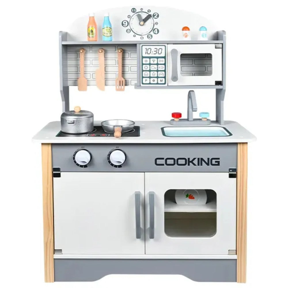 The Little Angel Wooden Kitchen Playset features a sleek mid-century design in grey, white, and...