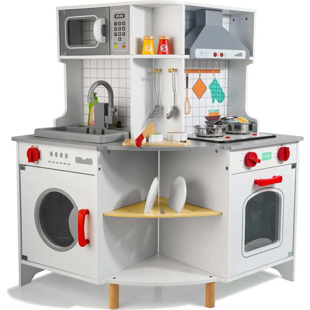 Luxury Kids Wooden Play Kitchen Set Pretend Cooking for Toddlers with Accessories Large Toy with Oven & Sink Storage Corner for Boys & Girls