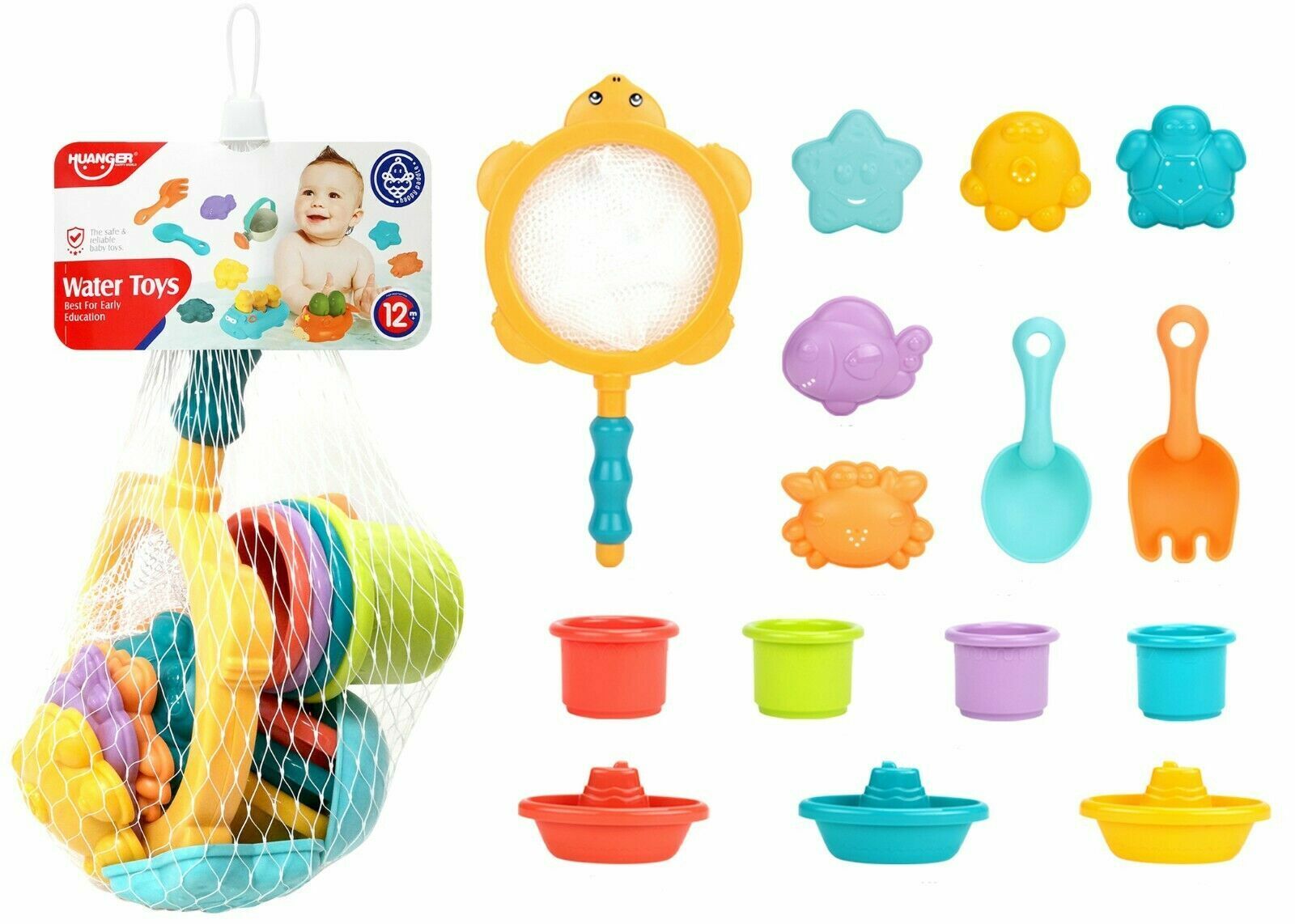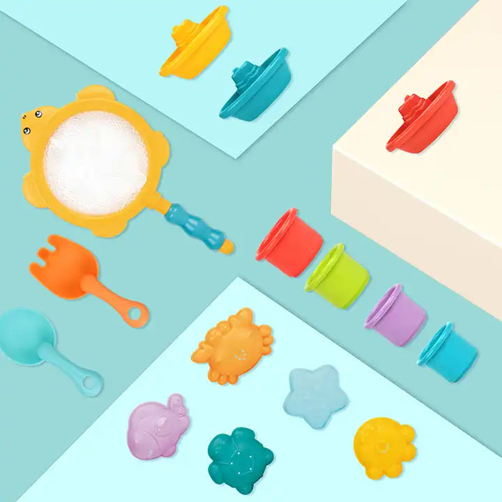 - 16-Piece Bath Toy Set: Includes floating animals, boats, water cups, and scoops to keep toddlers entertained during bath time.