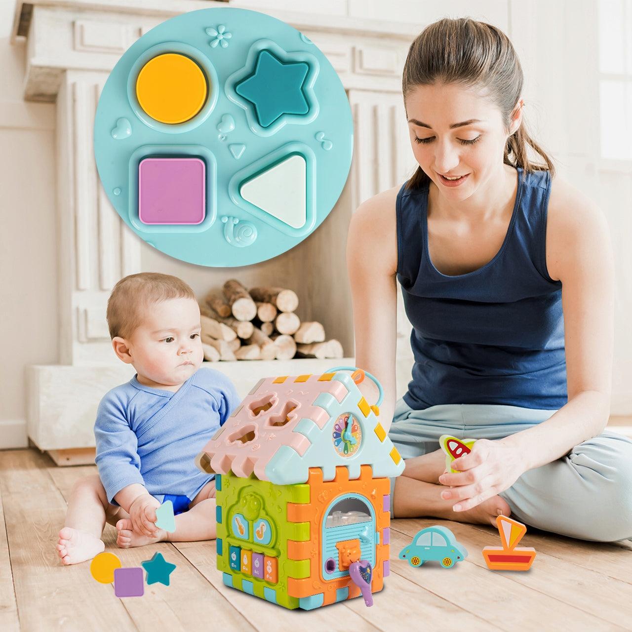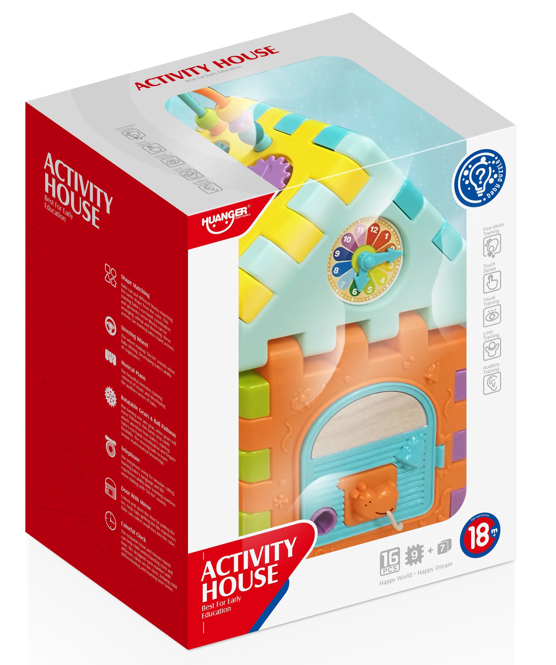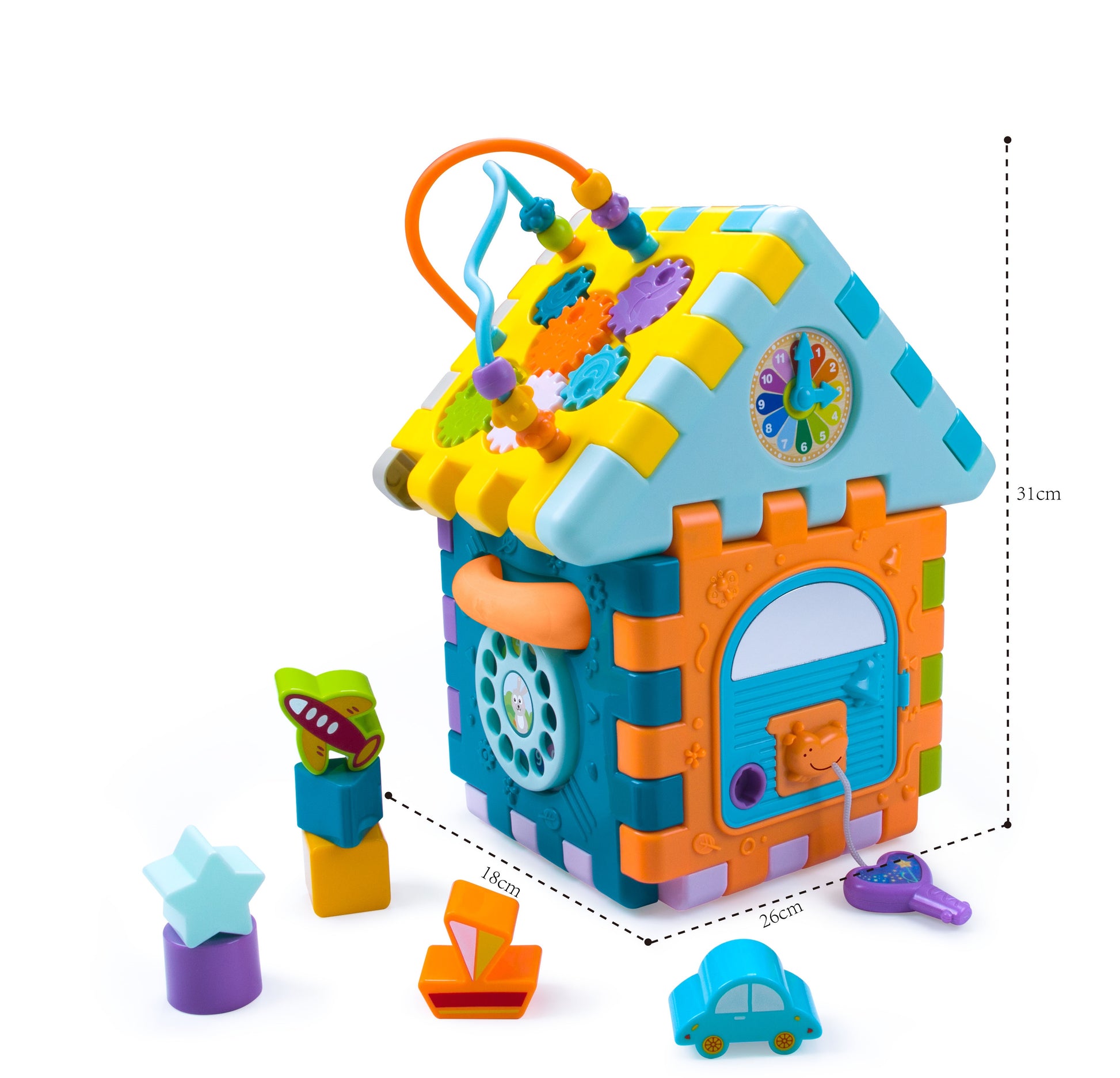 - Interactive Learning House: Includes various activities like a shape sorter, gears, telephone, and more to stimulate cognitive development.