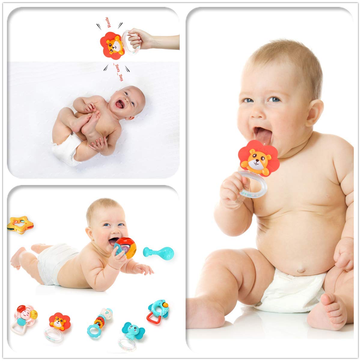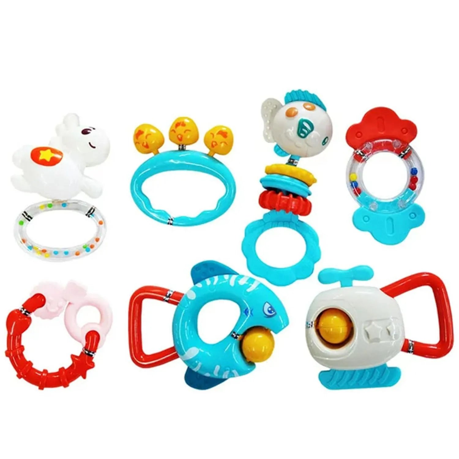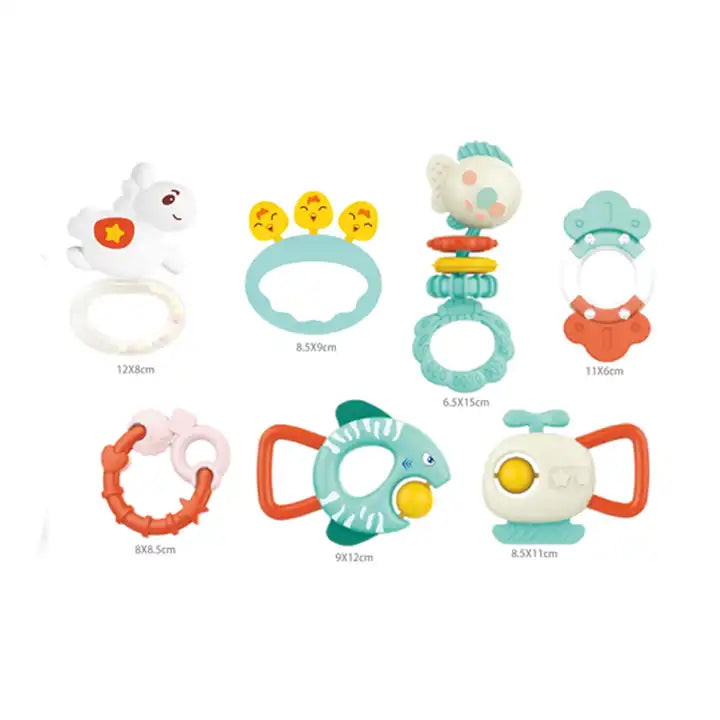 - 7-Piece Sensory Rattle & Teether Set: Includes a variety of colorful, engaging toys for sensory play and teething relief.