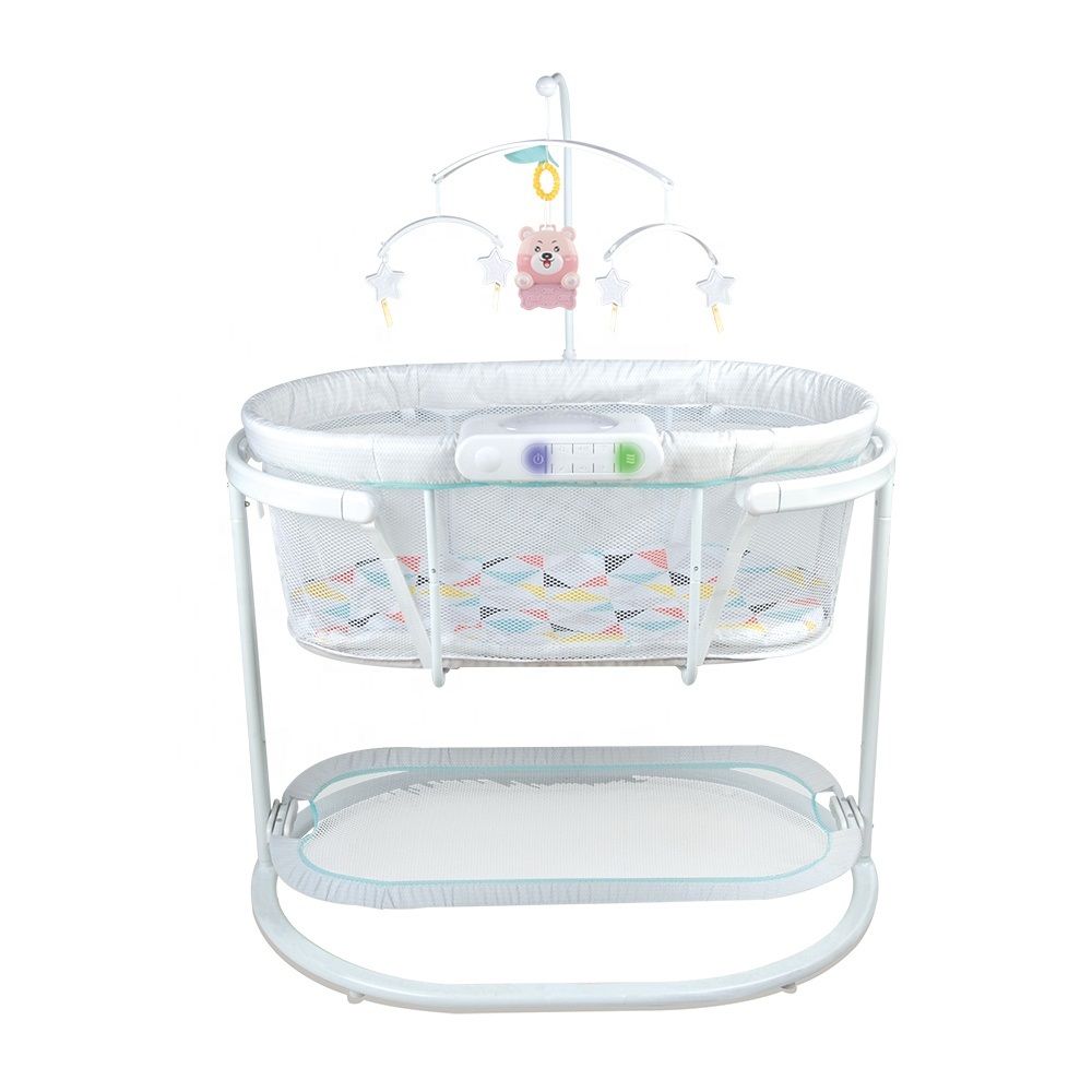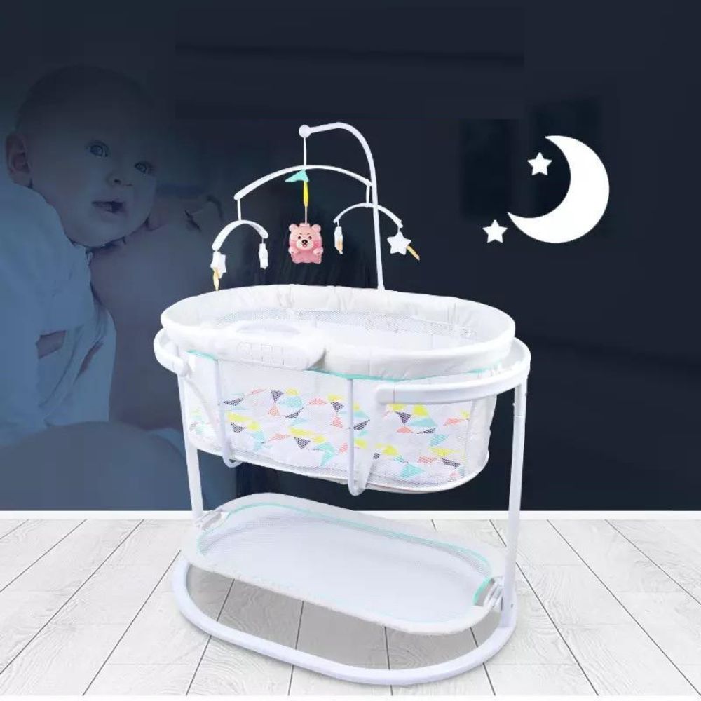 From soothing sways, music, and sounds to calming vibrations, light projection, and more, the soothing motions bassinet has everything to help your baby drift off to dreamland in comfort. As little ones relax on the comfy sleeping pad, they can look up at the mesmerizing overhead mobile with stars while they gently sway. Or, turn on one of the captivating light features, like the overhead projection. You can also remove the projector from the bassinet and use it as a tabletop soother! And, there's a convenient night light setting for an added sense of security. For extra coziness, activate the 30 minutes of calming vibrations and serene songs or sounds. Sweet dreams, baby! Where development comes into play Sensory: a variety of soft textures, calming vibrations, and swaying motion stimulate a baby's senses. Security & Happiness: soft padding, calming vibrations, and gentle swaying help soothe baby and become part of the nap and bedtime routine, giving baby a sense of security. Age grade is used only with a child who is unable to push up on hands and knees pull up or sit unassisted. Mesh sides for breathability. The mobile is designed to easily move to the left or right when placing the baby in the bassinet.