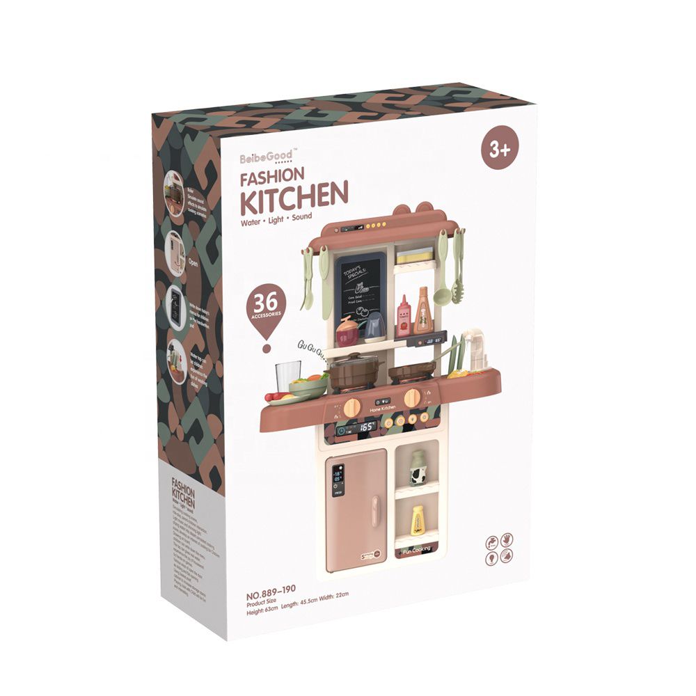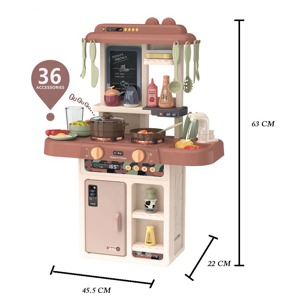 The music kids pretend play kitchen toys have 36 accessories. It is an educational toy where the child can grow their knowledge of daily kitchen activity. This toy stimulates cooking sense, this toy encourages parent-child interaction as playing cook with children will be fun and interesting