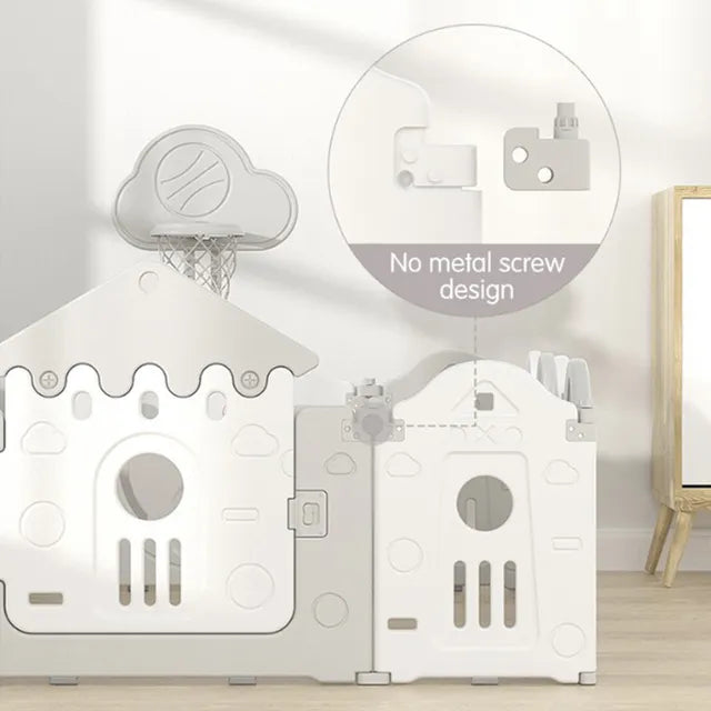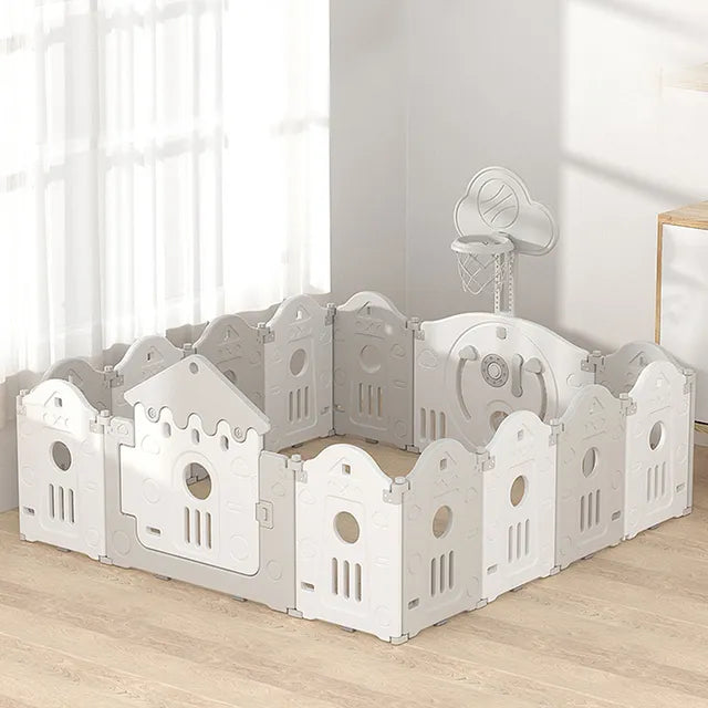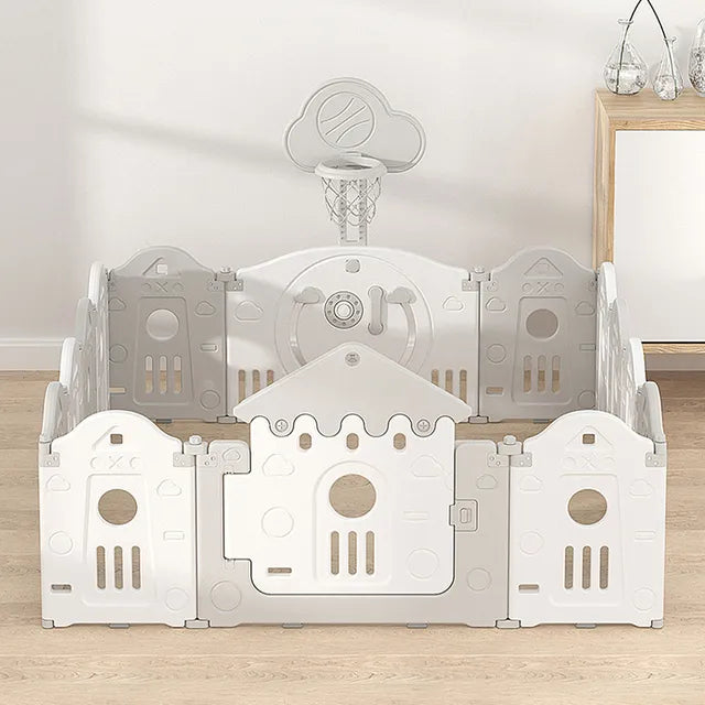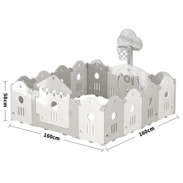 Create a safe and interactive play environment for your child with this Kids Playpen and Play Yard with Basketball Hoop. Designed for babies and toddlers, this foldable activity fence features a secure gate and a fun basketball hoop. Perfect for indoor use, it offers a spacious and safe play area, encouraging physical activity and imaginative play while ensuring peace of mind for parents.