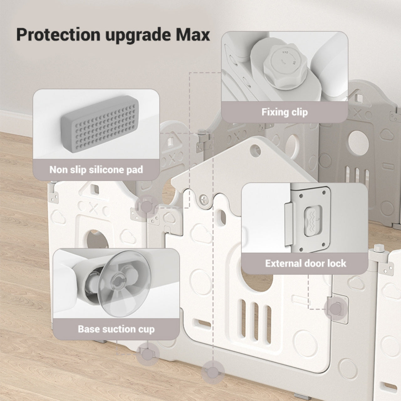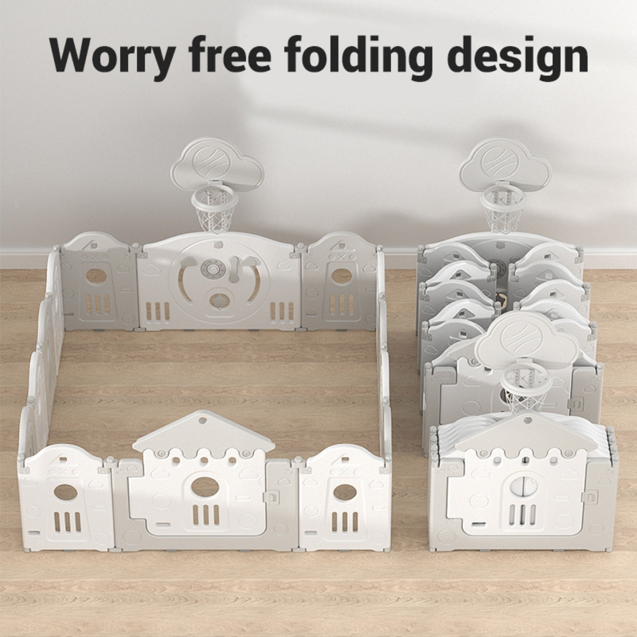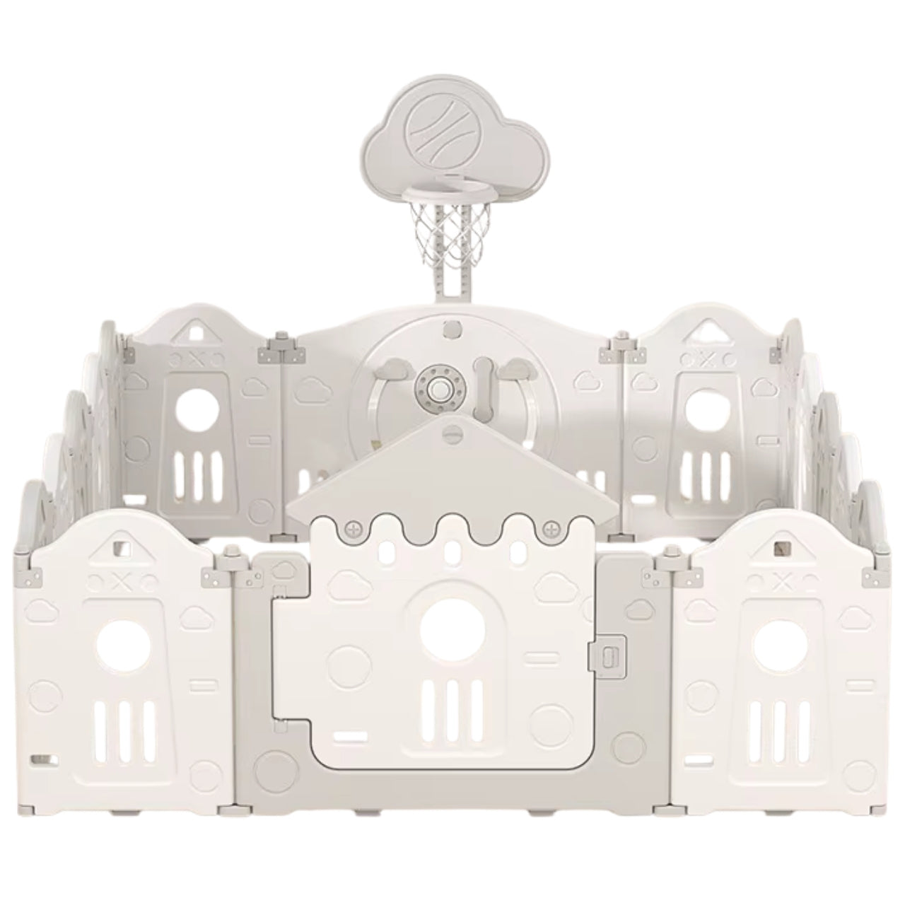 This comprehensive 14-piece set (12 small Grey and White panels, 1 door panel, and 1 game/activity panel) includes a fun basketball hoop, promoting active and engaging playtime. The Little Angel playpen's easy-to-use foldable design means storage is simple; when playtime is over, just tuck the panels away efficiently. Give your toddler a dedicated, secure space to explore and grow with this durable, feature-rich playpen.
