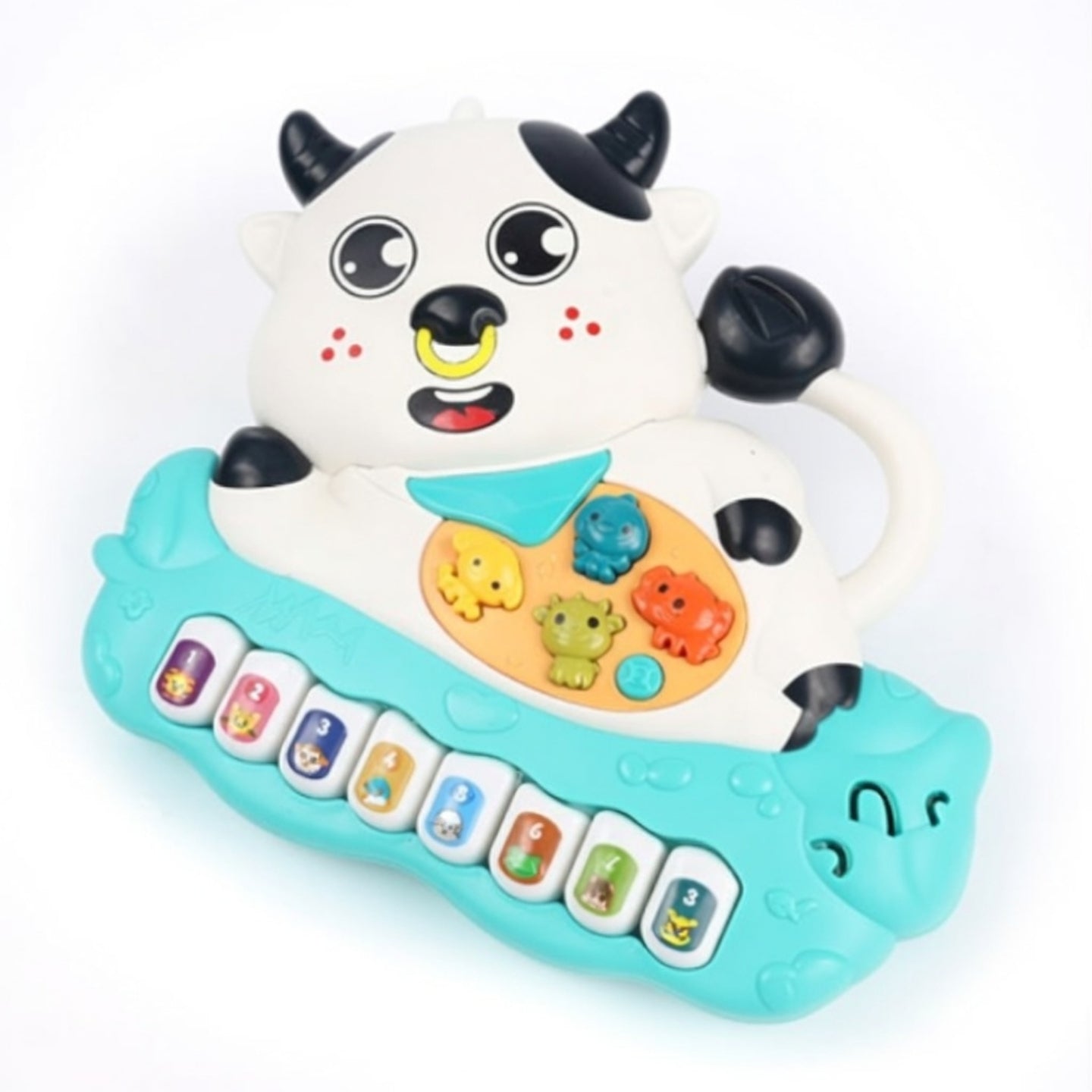 - Interactive musical cow toy with piano keys, sounds, and lights