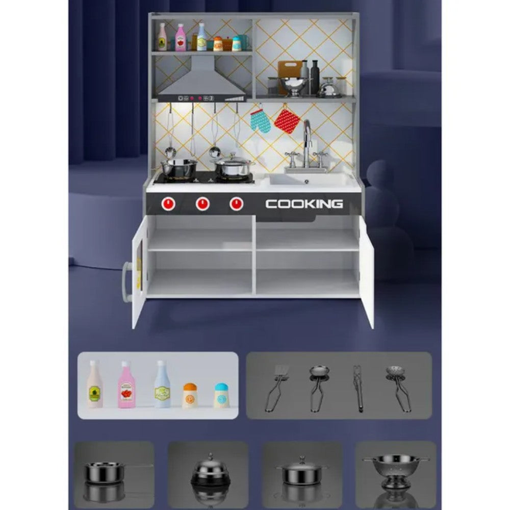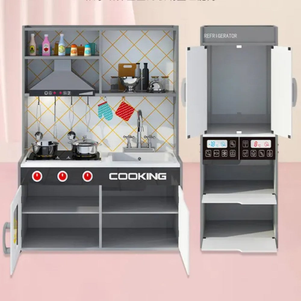 The Little Angel Kids Kitchen Wooden Playset features a sleek grey and white minimalist design with realistic accessories like utensils, pots, and pans. Built from sturdy wood, it includes a fridge, oven, sink, cooktop, chimney, and more—perfect for creative pretend play and early skill development.