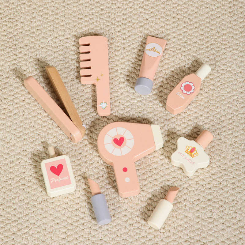 - 5 Realistic Accessories: Wooden brush, perfume bottle, lipstick, nail polish, and compact.